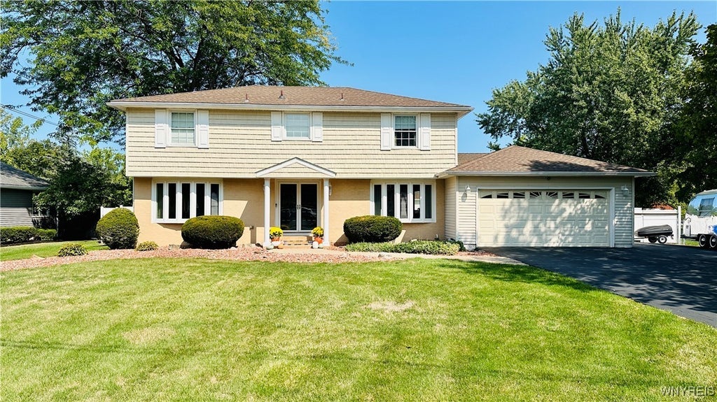 Welcome to 575 Morgan Dr, Lewiston, NY – A spacious and beautifully updated 2-story home offering 4 bedrooms, 2.5 bathrooms, and 2,262 sq ft of comfortable living space. The inviting living room features a cozy fireplace and large windows that bring in plenty of natural light. Hardwood floors run throughout the bedrooms, and all bathrooms have been tastefully updated. The kitchen is ideal for both everyday use and entertaining, with a large center island, built-in gas cooktop, built-in oven, and solid surface countertops. Step outside to enjoy a fully fenced backyard with a beautiful inground pool, a large patio, a shed for additional storage, and space to relax or entertain. The attached 2-car garage provides convenience, while a second detached garage in the backyard—currently used as a workshop—offers heat, and water, making it perfect for hobbies, work, or extra storage. Additional highlights include updated windows throughout, a modern tankless hot water heater, and excellent natural light throughout the home.