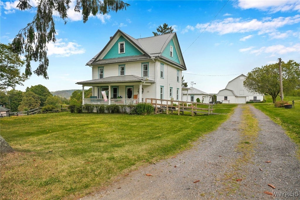 Welcome to this exceptional farm property just outside the Village of Franklinville, offering 48.07 acres of versatile land and well-maintained structures. The acreage includes 30 acres of hay fields, 9 wooded acres featuring maple, ash, cherry, an apple orchard, and a food plot, along with 8.07 acres of pasture. The maple stand provides an opportunity for syrup production, while the wooded and open spaces make this property ideal for a variety of agricultural or recreational uses. The farm buildings include a 120' x 36' barn with hay mow, 7 horse stalls, tack room, milk house with tie stalls, and barn cleaner. There is also a 2+ car garage. All buildings feature durable steel roofs for long-term protection. The spacious 2,600 sq ft home offers two stories of living space plus a full basement and full attic with stair access. Inside, you’ll find large rooms throughout, including a formal dining room (13x16) and a living room (16x15). The first floor also features a large accessible bathroom, a 13x11 office that could serve as a first-floor bedroom, and a front porch (26x10) with a handicap ramp. Upstairs are 4 bedrooms and a half bath. With 2,582 feet of road frontage and elevated views overlooking Franklinville, this property combines practicality with beauty. Public water service, thoughtful updates, and careful upkeep make this farm a rare find. A truly special property with tremendous potential—ready for its next chapter.