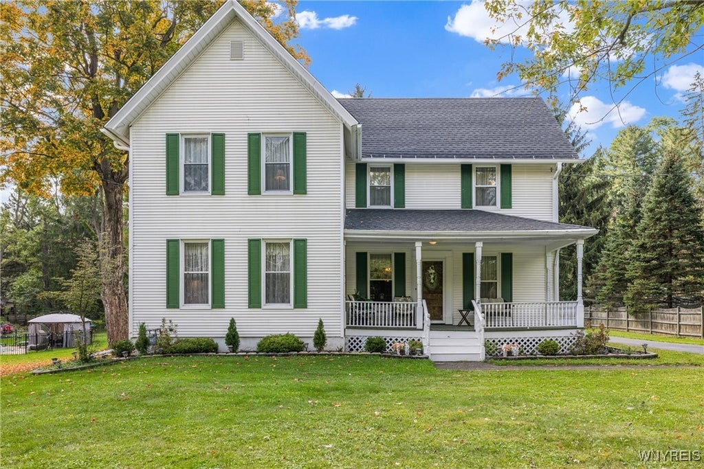 Welcome to this charming Orchard Park home, set on a picturesque 0.81 acre lot, just outside of the Village. Formerly the Old Henning Farm House, this property features a welcoming front porch, vinyl siding and a stunning eat-in kitchen with stainless steel appliances, subway tile backsplash, white cabinetry, luxury vinyl flooring & walk-in pantry. Entertain in the formal dining room with gleaming hardwood floors and French doors that lead to a cozy living room. The large family room boasts an electric fireplace, perfect for relaxing evenings. A versatile 1st floor bedroom (currently used as a gym) includes sliding doors to backyard & attached half bath. Additional full bath, coat closet, & 2.5 car garage w/epoxy floor on main level. Upstairs offers 3 spacious bedrooms, including a primary w/11x14 walk-in closet room. Large full bath w/jetted tub, separate shower, double vanity, makeup area & laundry space. Enjoy the summers in the 27x52 above-ground pool w/deck (2024). Paver patio w/ fire pit perfect for entertaining. Recent basement updates include new poured floor concrete.