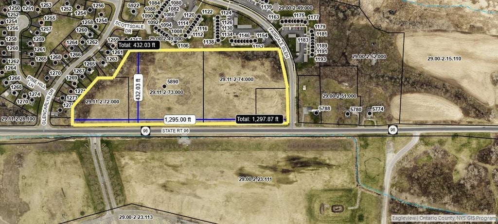 *** 12.5 ACRES OF COMMERCIAL / RESIDENTIAL LAND w/ 1295' FRONTAGE DIRECTLY ACROSS THE ROAD FROM THE MAIN ENTRANCE TO THE FINGER LAKES GAMING AND RACE TRACK *** Public Water and Sanitary Sewers available. The site consists of 4 separate tax map numbers. Must be sold together / will not subdivide - Primary Tax Parcel listed is 5.1 acres. Additional parcels - ( 2.01 ac ) 322800-029-011-0002-072-000 , ( 4.41 ac ) 322800-029-011-0002-074-000, ( .98 ac ) 322800-029-011-0002-075-000 for a total of 12.5 acres. The land is located between Glen Carlyn Drive and Fairdale Glen. Farmington Zoned R-7.2 - allows Commercial / Residential development.