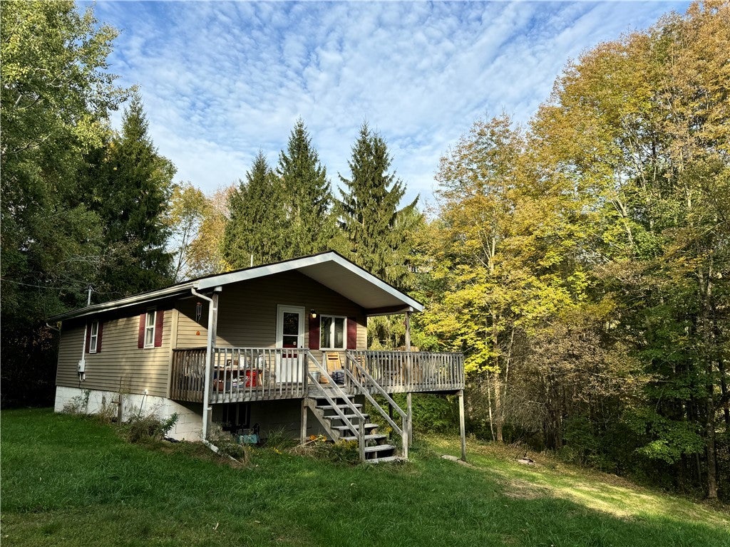 COZY CATSKILLS RETREAT, just minutes from the Pepacton Reservoir, and a short drive to all of the popular destination towns of the area. This adorable 2 bedroom, 2 bath Catskills country cottage offers everything you need to enjoy your very own special slice of heaven. Enter to an open floor plan where living/dining/kitchen flow seamlessly together to create the ideal space for gathering with family and friends. The sliding glass doors offer beautiful views of the woods and give access to the deep wrap around deck where you can enjoy long summer evenings, sunny afternoons and the peaceful sounds of nature. The family room is located at the lower level with walk out access to the yard along with 2 bedrooms, bathroom w. shower, laundry area and ample closet/storgage space. A second bathroom w. shower is located on the upper level. Recent improvements include new hardwood floors, UV Filter, new light fixtures, workshop in the shed and the septic tank was replaced in 2024. Set privately on a mostly wooded & gently sloped lot with a convenient wrap around driveway and easy access to the main road. Conveniently located 2.15 hrs. from the GW Bridge, centrally located to all the area towns, shops, galleries, eateries and outdoor activities.