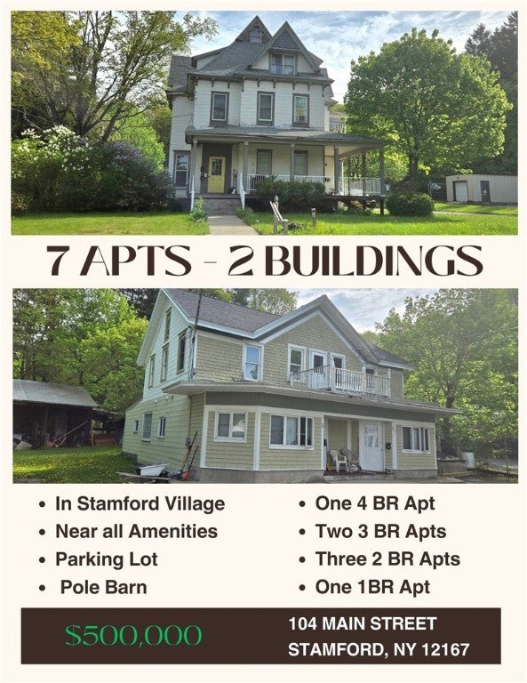 Please note: This is only one of the two apartment buildings of listing MLS#: R1608693 that contains both buildings (the other is a 3 apt building) for $500,000. See that listing for full details. PRICE IMPROVEMENT: A rare and versatile investment opportunity awaits in the heart of the Village of Stamford, where rental units are in high demand. This distinctive property spans a half-acre and features seven rental units across two separate buildings, offering excellent income potential in a highly walkable, sought-after location. Whether you're an investor or seeking a live-in property with supplemental income, this well-maintained complex presents endless possibilities. The front building houses four apartments, including a spacious ground-floor 3-bedroom, 1.5-bath unit with a kitchen island, dishwasher, private back deck, and patio. A comfortable 2-bedroom unit includes a laundry room, while a cozy studio offers access to a charming portico. A large 4-bedroom apartment features a finished attic, ideal for added living space or a fifth bedroom, along with a dishwasher. The building also offers basement access with potential for tenant storage, and a power lift chair for accessibility to the second floor. A brand-new boiler was installed in 2024. The rear building includes three additional units. One is currently used as a 3-bedroom, another is a 2-bedroom with a gas stove, and the third is a vacant 2-bedroom, 1-bath “owner’s apartment” with a private sitting deck—perfect for on-site living or premium rental income. All apartments are equipped with washers and dryers, thermal windows, and designated parking. Additional amenities include a large covered front porch, a back deck, a private patio, and a separate pole building ideal for storing maintenance equipment. Residents enjoy unparalleled convenience, just steps from the grocery store, restaurants, library, public pool, school, bus stop, and local shops. This is a rare chance to own a multi-unit property in one of Stamford’s most walkable and charming village settings.