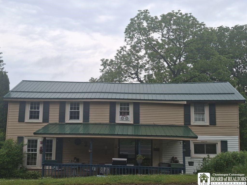 Spacious 4 Bedroom 1.5 bath Colonial Cottage on approximately 1.10 acres, with covered front patio and sliding glass doors for a relaxing outdoor space just off the open kitchen dining living room area with the original open beamed ceilings. Off the living area and to your left a spacious primary bedroom, tall ceilings and lots of closet space. Down the hall step into a small office/pantry/storage/media room, first floor full bath and shower boasts plenty of room for dressing and also a first- floor laundry area. Up the original wooden stairway takes you to a small loft/reading nook/office area, with plenty of under eave storage in the hallway, two bedrooms and a half bath. The left side of the home features a raised deck area and side entry hall with coat closet. There is a full basement with dirt/gravel flooring and a back yard walk out. Many new upgrades since seller purchased home include New Roof 2021, new furnace and duct work 2021, new support beams, new water heater, new first floor bath renovation, all new kitchen plumbing, added outside faucet, Septic was last pumped 6 months ago. Well has new water pump and well head extension. All the heavy work has been done, a few cosmetic touches will make this a wonderful lake home retreat. Can be all season or seasonal. Perfect for an airbnb with the right certificates of occupancy. There is a metal shed for storage. View of the Lake from the top floor. The lot extends down the sloped hill and is marked with ribbon. There is a firepit for summer nights and friends. Close to Findley Lake, winery trails, Erie, PA, the snowmobile trails, Pine Junction Restaurant, Peak N Peek ski resort. Findley lake is perfect for kayaking, boating, hiking, biking, and fishing, and so much more, within minutes to Chautauqua Institute.