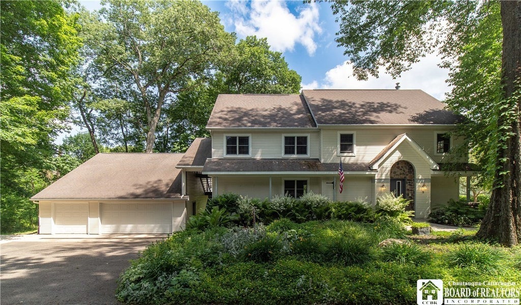 Experience Lakeside Living at Its Finest! Imagine relaxing in your peaceful backyard, taking in serene views of Bemus Bay on Chautauqua Lake, with the soothing sounds of birds and wildlife drifting over from nearby Long Point State Park. Located in the desirable lakefront community of Summit Park, this exceptional home was thoughtfully designed to showcase the stunning natural surroundings. Ideally situated near the trail head to Long Point State Park, providing easy access to hiking, cross-county skiing, snowmobiling and a variety of outdoor recreational activities. Lush, natural gardens provide a charming welcome, while inside, floor-to-ceiling windows frame breathtaking lake views from the moment you enter. The open-concept living space is ideal for entertaining, featuring a custom wet bar, wood-burning fireplace, and gleaming hardwood floors. The dining area, highlighted by Pella double sliding glass doors, opens directly to the expansive rear deck and backyard. The spacious kitchen is a chef’s dream, offering a large center island, double ovens, and a generous walk-in pantry. A versatile bonus room on the first floor—previously used as a den—presents endless possibilities: a home office, formal dining room, or even a first-floor bedroom. Also on the main level are a full bathroom, laundry room, and utility closet. Upstairs, the primary suite offers panoramic lake views, a walk-in closet, and a luxurious four-piece bath complete with a Jacuzzi tub. Four additional bedrooms and another full bathroom provide plenty of space for family and guests. The heated three-car garage includes abundant storage or workshop potential, with a finished second level perfect for a rec room, game room, or additional guest accommodations. As part of the Summit Park community, you’ll enjoy access to Chautauqua Lake and a shared boat dock with private boat slip. HOA fees are $750 semi-annually. Don’t miss this rare opportunity to own a truly one-of-a-kind lakeside retreat!