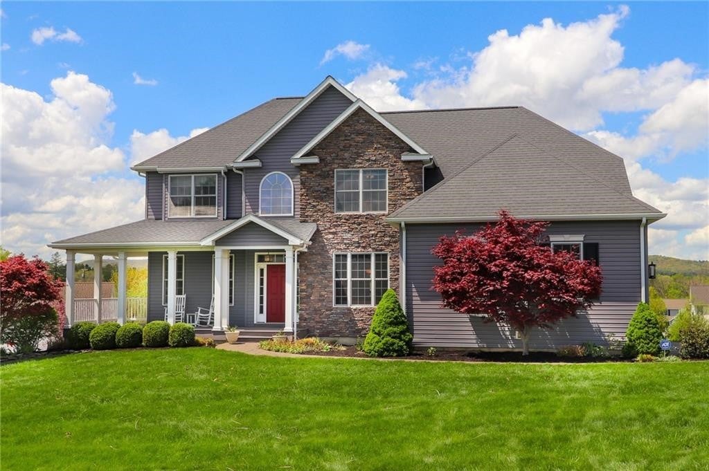 Welcome to your dream home in Horseheads, NY—just 25 minutes from the scenic beauty of Watkins Glen and the renowned Finger Lakes region. Situated in highly desirable Barrington Estates, this phenomenal Jim Allen build blends upscale craftsmanship with modern comforts. Step inside and be greeted by a bright, open floor plan flooded with natural light. The 18-foot ceilings in the great room, maple hardwood floors, upgraded trim, and wired-in sound set a tone of quality throughout the home. Dual heating and A/C units allow for zoned heating and easy comfort in any season. A gourmet kitchen features high-end stainless steel appliances, double oven, an open layout, and direct access to a large deck offering panoramic views—perfect for entertaining or unwinding. The vaulted first-floor Owner’s Suite with loft also boasts a large walk-in closet and sizable en-suite bathroom featuring a tile and glass shower with body sprays. With 4 spacious bedrooms upstairs and a potential 6th bedroom in the finished walkout lower level, there’s room for everyone. The lower level also boasts soundproofed walls, ideal for a media room or home theater—enjoy your favorite shows without disrupting the rest of the home. Outside, enjoy a covered patio complete with a stunning stone bar, perfect for summer gatherings or cozy fall evenings. Nothing left to do but move in and start enjoying upscale living in the heart of New York’s wine country.