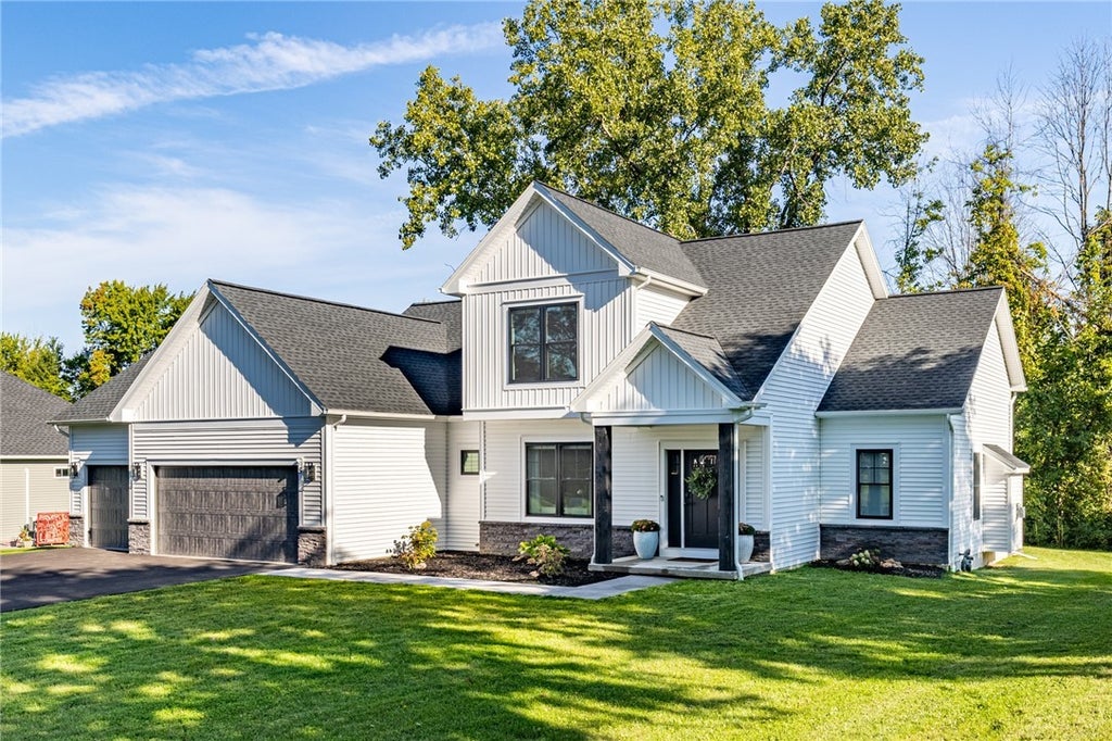 PUBLIC REMARKS: Impeccably 2023 Built Redstone Custom Home Loaded with High-End Upgrades & 2025 Improvements, in one of Penfield’s Most Desirable Neighborhoods, on a cul de sac street! 3-5 bedroom, 3-bath home combines quality craftsmanship with luxury finishes throughout. Open-concept layout features soaring 12’ ceilings in the foyer and living room with coffered ceiling, luxury vinyl plank flooring and Quartz countertops. The gourmet kitchen boasts Wellborn cabinetry, upgraded hood, slide-out storage, and a vertical baking sheet cabinet. The 1st-floor primary suite includes a step ceiling, his and her closets, and full tile shower with a granite bench. Additional full bath on the first floor includes a deep soaking tub with tile surround. Flexible layout offers 3/4 bedrooms/study, and a convenient 1st-floor laundry. Upgrades include: 3-car fully drywalled garage, craftsman-style trim, doors, and railings, tankless water heater, 250 series vinyl windows & slider with built-in blinds, extensive recessed lighting, radon mitigation piping, upgraded plumbing and toilets, Board and Batten siding. 2025 homeowner improvements: New front walkway and landscaping, newly installed rear patio, custom bench & cubbies, stone garden wall, approximate 480 square foot professionally finished basement, with an egress window, for a possible 4th/5th bedroom, roughed-in plumbing ready to add a full bathroom, dawn to dusk smart lighting, and a brand-new driveway. Home offers quality construction, smart design, and elegant finishes in every detail!. The seller's actual building cost with upgrades and improvements, $710,000.