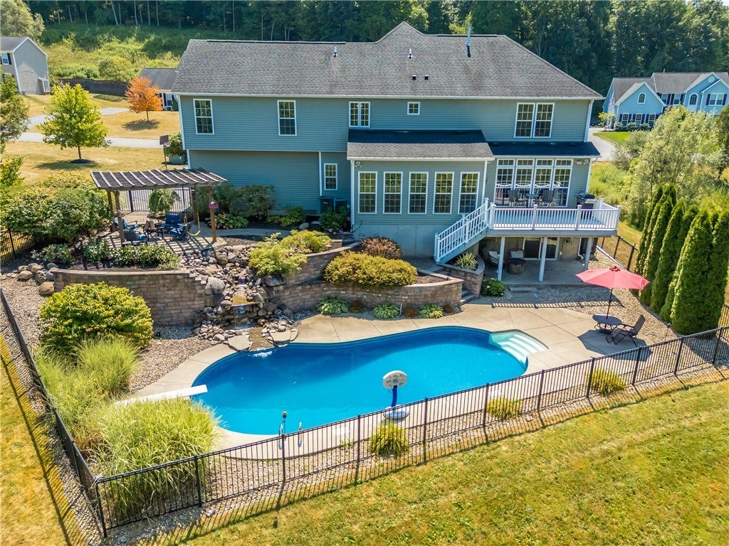SPECTACULAR & GRAND RESORT-STYLE ESTATE situated on over 1.5 RARE ACRES with an in-ground pool featuring a gorgeous stone waterfall, a pond, and a creek meandering through the woods... all with a showcase DREAM HOME boasting over 4,000 sq ft of living space & high-end finishes! This is a rare opportunity to own a million-dollar backyard designed for making millions of memories, with exquisite landscaping & hardscaping, featuring a custom stone waterfall that trickles into the in-ground pool, surrounded by a patio area for sunbathing & cannonballs, an elevated deck & a paver patio with a pergola- truly an entertainer’s dream backyard overlooking the scenic pond & creek! This stately home welcomes you with a GRAND TWO-STORY FOYER with a Palladian window & beautiful hardwood floors. The STUNNING GREAT ROOM offers phenomenal open living, featuring a designer kitchen with gorgeous cabinetry, high-end stainless steel appliances & an expansive center island breakfast bar overlooking the living area with a gas fireplace & a wall of windows. A SPECTACULAR VAULTED-CEILING MORNING ROOM with a wall of windows provides serene views of the backyard & access to the deck... perfect for both everyday living & upscale entertaining. An expansive formal dining room with crown molding & a chair rail. A spacious EXECUTIVE OFFICE with a bay window offers peaceful views of the pond. Convenient 1ST floor laundry & powder room complete the main level. Upstairs, the luxury continues with four spacious bedrooms and two full bathrooms, including a massive PRIMARY SUITE with two walk-in closets & a spa bathroom designed for relaxation. The ULTIMATE WALK-OUT LOWER LEVEL is built for fun and entertainment, with a custom bar, a spacious great room for games or activities, a movie theatre with elevated seating, plus a full bathroom (1,100 sq ft included in sq ft) This residence truly has it all—an entertainer’s paradise, a private retreat, and a showcase property rolled into one. Premier location just minutes to the Hamlet of Mendon, Village of Victor, & Eastview Mall, with restaurants & shops, easy access to 490 & NYS Thruway! Negotiations 8/26/25 at 10 AM.