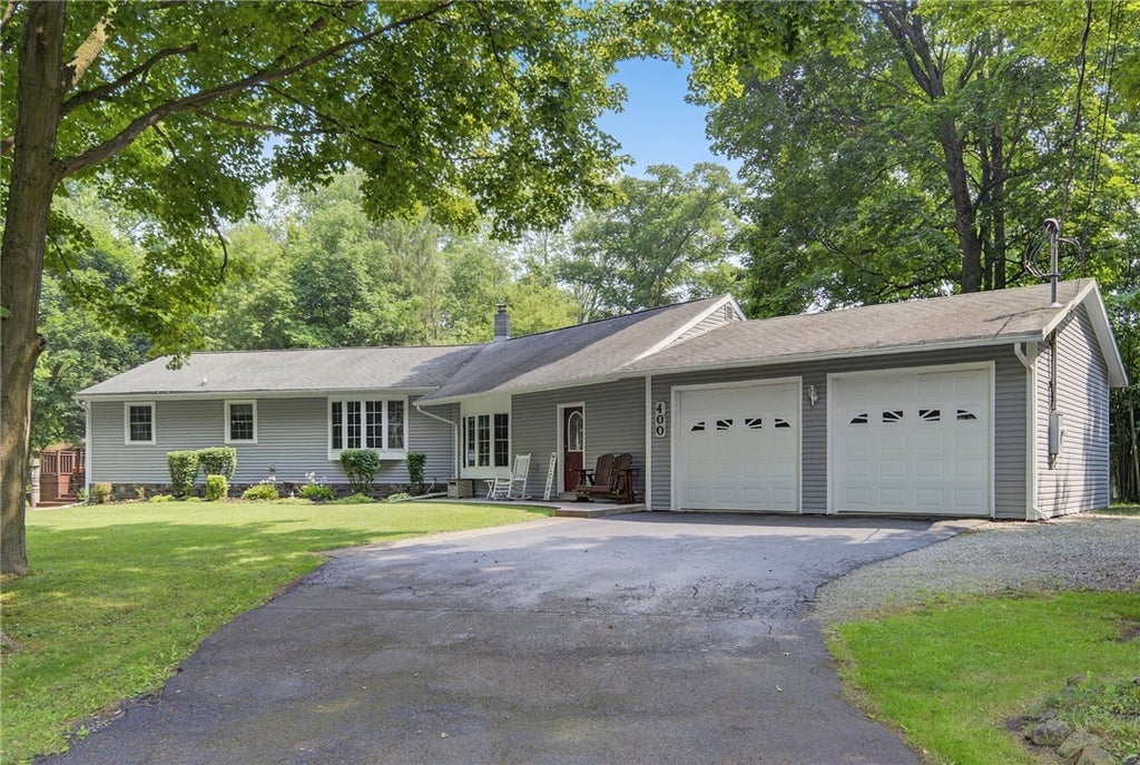 Discover a charming, well-maintained, easy living in this 4 bedroom, 2 bathroom Ranch home, perfectly located on a peaceful 4.05 acre wooded corner lot within the Village of Groton. Experience the luxury of true seclusion combined with the ease of municipal water, sewer and electric. This unique property includes a building lot, perfect for future development or investment opportunities. Enter into the spacious living room with vaulted ceilings, ample amount of natural lighting, bay window and a sliding glass door to a composite back deck. The upper living area is used as a sitting area with hardwood floors, and a beautiful bay window overlooking a relaxing wooded area. The kitchen is spacious with a sliding glass door to another composite deck. The spacious primary bedroom features a walkout french door to a 6 person private hot tub to escape and unwind from a busy day. Fully functional basement with bar, regulation pool table, wood stove, living area, laundry area with full bathroom and walk in cedar closet. An attached 2-car garage with upper storage space and a12' x 12' storage shed located in the backyard.