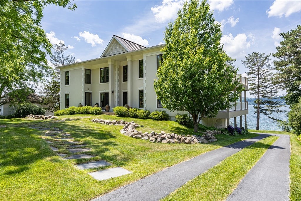108' Prime, easy-access Canandaigua Lake Waterfront. For boaters and sun-bathers: You own your own private pristine shale beaches on both sides of your large permanent no maintenance 35'x20' aluminum dock. For Anglers: Favored "shelf" fishing on widest part of the Lake. Dock, moor, tie-up, or install your boat hoist. Multiple heavy duty cleats for secure docking. Secure kayak and sailing storage below dock. Solid poured concrete break wall. For gracious living and Entertaining: Multigenerational living on a rare level lot. "Above the road" property never known to flood. 5000sf+ "New construction" on CANANDAIGUA LAKE! Custom designed and built in 2013 with floor-to-ceiling Anderson triple pane windows and doors featuring S-E-V-E-N bedrooms and seven full handicapped-accessible baths! Ideal for big families, multiple families, and seasonal guests: Three fully-equipped gourmet kitchens, wet bars, plus an additional summer kitchen with an infrared grill and natural gas granite fire pit. Relax in privacy on your own exclusive floor and decks. Enjoy your own private kitchen, family room, multiple dining areas, heated granite floors throughout, thermostatically controlled natural gas fireplaces, and multiple bedrooms and baths. Custom oak staircases, railings, crown moldings, and baseboards. Best and highest quality finishes. Fully handicapped accessible "zero-step" home. Large elevator connects or "locks out" each of three floors, garages, and six decks. Super-insulated closed cell foam home. Total utilities cost only $1700 per year! Automatic whole house Generac ensures year-round peace of mind. For worry-free Lake Living: Relax on SIX private, no-maintenance premium AZEK DECKS secured by custom color, powder coated, aluminum railings. For boat and car enthusiasts: Heated FOUR + CAR GARAGE WITH three double pane insulated glass automatic operating garage doors and screen doors to enjoy expansive Lake views, cross-ventilation, abundant natural light, greenhouse/solarium amenities. No maintenance 100% POLYASPARTIC heated FLOORS. MOVE IN-ready before Columbus day!! PRISTINE PERFECT! The square footage difference is per Seller.