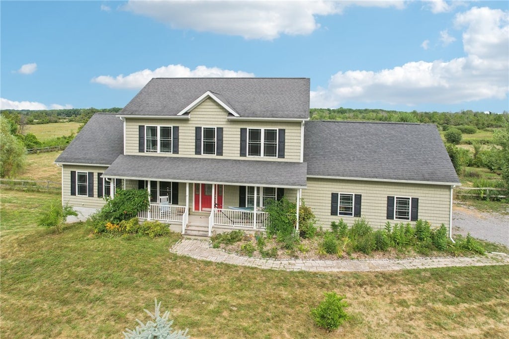 This exceptional 30-acre estate in the prestigious Honeoye Falls-Lima School District features a 4-bedroom, 3.5-bathroom home with first-floor primary suite featuring an oversized bathtub, first-floor laundry, 2-car garage with a 2nd level and full staircase access for storage or teen suite, extra tall insulated basement, and versatile attic spaces above the 2nd floor AND a spacious walk-in area ideal for converting into an office, playroom, or studio. There is another full Suite on the 2nd Floor (Bedroom, Full Bath and Walk-in Closet). The home's elegant cherry kitchen showcases stainless steel appliances and a premium double stove, perfect for serious cooking. Read a book by the cozy gas fireplace or enjoy outdoor living on the composite deck and front porch. Generous closet space throughout keeps everything organized. Sustainable living is enhanced by geothermal heating, comprehensive water purification system, and solar panel hookup readiness. The unique outdoor shower with hot and cold water connections adds convenience for outdoor enthusiasts. Your private 30 acres include 10 wooded areas, fully fenced yard with mature apple, cherry, hazelnut, and pine nut trees, plus diverse native plantings. Practical amenities include a concrete kennel pad, chicken coop, and stone driveway. Positioned for ultimate privacy yet conveniently close to Geneseo, Canandaigua, Victor, and Rochester. This peaceful sanctuary offers incredible stargazing opportunities under dark country skies. Whether seeking space for family life, sustainable living, or a tranquil escape with modern conveniences, this remarkable property delivers luxury, functionality, and natural beauty in perfect harmony.