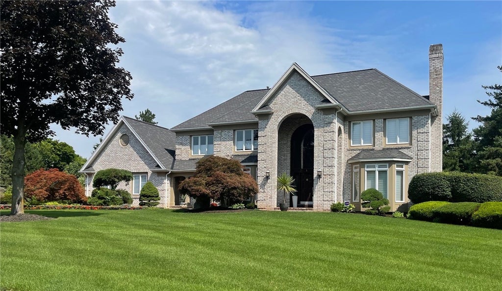 The Manors — an exclusive community of 16 stately, custom-built homes in a sought-after area of Pittsford. This finely crafted residence was designed by well-known regional designers. The home offers a blend of classic and modern designs, architectural features, and millwork, along with a private outdoor space with patios and a pool. The grand foyer is highlighted with Absolute Black granite flooring, one-of-a-kind crafted Nancy Gong glass doors, and detailed moldings. The two-story family room, with its Brazilian Cherry flooring and expansive windows, is highlighted by a floor-to-ceiling angled European tile wall with a built-in horizontal gas fireplace. The kitchen seamlessly connects to the family room, formal dining room, and a large patio overlooking the resort-style grounds. The formal dining room is highlighted with a Swarovski Crystal Globe chandelier and a gold-leafed tray ceiling. The living room blends classic design features and elegance, with custom moldings throughout, a wood-burning fireplace and a bay window. A private study/library with French doors and built-in bookcases provides an ideal environment for remote work or quiet space. Upstairs, the entire second floor features tongue-and-groove hardwood flooring and four spacious bedrooms with three full attached baths. Each bathroom has been renovated with high-quality finishes, including European marble. The Primary Suite features a tray ceiling and a luxurious en-suite with whirlpool tub and dual sinks with a waterfall quartz countertop. Attached to the Primary Bath is a custom-built cherry walk-in closet and an additional cedar closet. Each bedroom has direct access to a full bath. Outside, the grounds include an underground, automatic, zoned irrigation system, a stunning gunite pool, multiple brick patios, and a fully fenced yard. A home of this caliber, in such a private and desirable Pittsford location, is truly a rare offering. Some of the furniture is available and may be purchased separately.