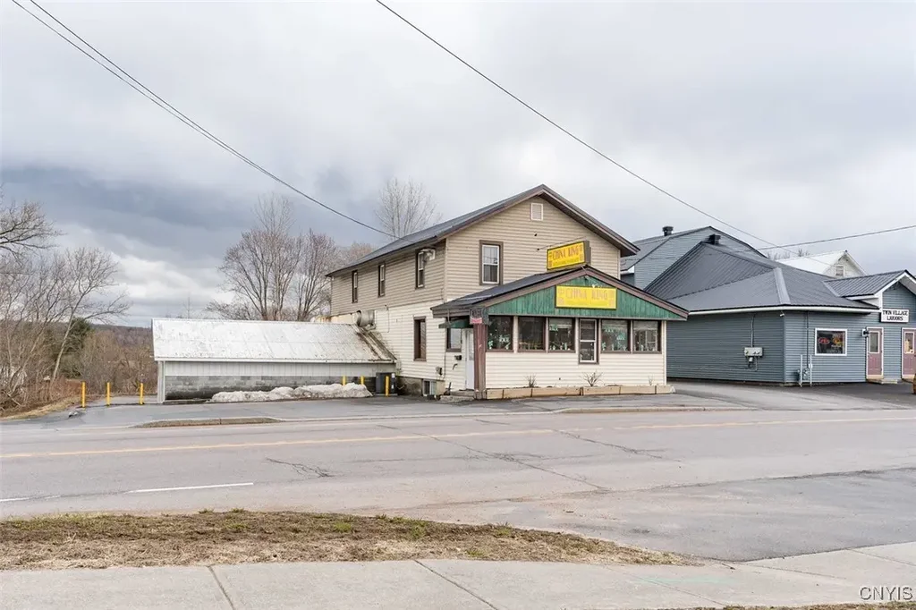 Location is key & this turn-key restaurant opportunity comes with excellent exposure & living quarters above. Located at a busy intersection it provides high visibility & established customer traffic. This well-maintained property will come with a fully equipped & functioning kitchen complete with all stainless-steel restaurant equipment, walk in cooler, buffet warmer, prep tables, 2 half baths & seating for 50. New natural gas furnace & central Air for climate control. Updated windows throughout & a new metal roof. Ample parking for 20 vehicles with handicap parking in front & completely blacktopped. Live on site in the oversized 4-bedroom 1 bath apartment above that heats with electric baseboard. There is a full dry basement with additional storage rooms, laundry facilities & leads to the 2 car attached garage. Multiple lots are included in this sale equaling 1.46 acres in the village! This high visibility commercial space is the prime location to make your restaurant dreams come true!