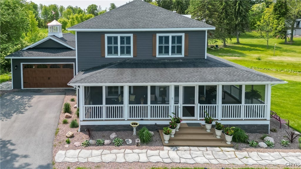 Talk of the Cape Riverfront home just 7 yrs young. Complete refresh in 2024. Kitchen with custom tin back splash, granite to die for, accompanied by the very best Bosch appliances. All new lighting with remote fans, all nickel hardware along with all new luxury vinyl flooring. Every window is updated with high end plantation shutters to compliment the Georgian style fully screened porch. The insect free screened porch adds an additional 500sq ft of living space. 3 bedroom and 2.5 baths, fully remodeled, a family focused gathering room for those needing extra space. The sprawling property consists of a 225ft of the much sought after mighty St. Lawrence River. You have your own beach house on the shore conveniently positioned for those warm afternoon dips and the barbeque to follow. The way this prime property is situated there's never a risk of high water or flooding. An additional building on the rear of the property for the golf cart or rec vehicle designed with an easy access overhead door. Oh, and by the way you will always have the beacon of the cupola lit every night on the recently built 30x36 garage to guide you home to what people call paradise. Owners are willing to entertain offers for the furniture, all of which is less than 2 years old. This is a must-see property!
