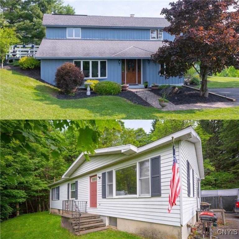 Perched on a scenic hilltop with expansive panoramic views, 847 Jordanville Road is a truly unique country retreat offering privacy, comfort, and versatility across 13.3 acres. With two full residences, a large garage, a heated drive-through workshop, and unmatched panoramic views, this property is the perfect blend of rustic charm and modern practicality. The main residence is a fully-furnished 3-bedroom, 2-bath home designed to capture natural beauty from every angle. The home is oriented solar south, making it ideal for future rooftop solar panels. From the entire east side, enjoy breathtaking sunrise views, while the primary suite on the upper level offers the perfect vantage point for stunning sunsets from a private deck. Inside, you'll find exposed wood beams, warm wood finishes, and a soapstone wood stove set against a brick hearth that anchors the cozy family room. The kitchen features rich wood cabinetry, stainless steel appliances, and a comfortable layout ideal for daily living or entertaining. Upstairs, the spacious primary suite includes a sitting area or office space, his-and-her closets, and direct access to a private deck. The home is also partially earth-bermed, helping it stay cool in the summer and warm in the winter. Step outside to the patio, to barbecue, entertain or just relax at the table overlooking peaceful wooded acreage—don’t be surprised to see deer or wild turkeys roaming the lawn. The detached garage offers excellent storage for vehicles and tools, and the fully insulated, heated, and drive-through workshop is perfect for year-round projects or serious hobbyists. Adding to the property’s rare appeal is the fully independent guest home—a modular residence built with durable 2 x 6 studding, set on a full basement, and featuring 3 bedrooms, 1 bath, a full kitchen, and a comfortable living space. Both homes have been meticulously maintained, with no history of smoking or pets. Whether used for family, guests, a rental, or a caretaker’s quarters, this second residence adds incredible flexibility.