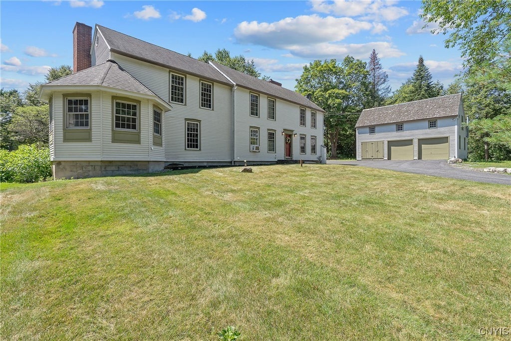 Discover timeless character and modern comfort in this one-of-a-kind saltbox style home, built in 1979. The home has been lived in and cherished by its original owners. Nestled on just under an acre in the scenic hills of Marcellus, this 4-bedroom, 2.5 bath home blends historic charm with thoughtful craftsmanship. From the moment you step inside, you will feel transported to another era. Rich woodwork, custom kitchen cabinetry, two wood burning fireplaces, and a cast iron wood stove set the tone, creating warm and inviting living spaces. The bar room, complete with all oak woodwork, is perfect for entertaining and adds a truly unique touch. The home includes a mudroom, living room, family room, a dedicated office, formal dining room, bonus area upstairs, and a spacious laundry room that all offer functionality for modern living. Outdoors, enjoy the serenity of the countryside with a wraparound back deck with an enclosed gazebo perfect for any season. Included on the property is partially heated three car, two story garage that is hard wired for a personal wood working shop and an additional outbuilding for gardening tools, hobbies, or extra storage. All this just minutes from Marcellus central schools' campus, 8 minutes from major highways and 15 minutes from downtown Syracuse- a perfect balance of peaceful privacy and easy access. Do not miss the rare opportunity to own a home that truly stands apart- rich in history, strong in character, and ready for its next chapter