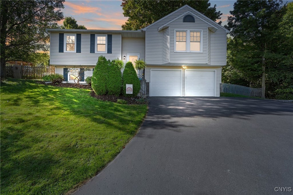 Welcome to 113 Vantage Drive! What a picture perfect spot for this well maintained raised ranch built in 1988. Beautiful views of a quiet neighborhood with easy access to East Hill Elementary School, churches and shopping. Expect to be impressed by the open floor plan of this home! From the custom kitchen remodel with cherry cabinets and granite counters (including an island with a breakfast bar) to the catherdral ceilings with skylights (skylights with remote controlled shades installed in May of 2025). Bamboo hardwood flooring, wood burning fireplace and the sweetest window seat in the living room! Spacious dining area and a newly installed slider (September 2025) that takes you to the deck area. Three good sized bedrooms, full bathroom with tile and granite top vanity. The lower level offers a finshed area which is perfect for an office, gaming or enjoy the home theater! Half bathroom, laundry room and storage with easy access to the 2 car garage! Enjoy the beautiful landscaping and perennial plants and bushes in the backyard. Lovely retaining wall creates the perfect spot for a cozy firepit in the summer or cool fall evenings! Deck area has room for furniture and a separate eating area that gives you the prettiest views overlooking the hills of Camillus. So many updates! Roof in May of 2025, lower level windows in 2021, Zero Draft insulation in April of 2025, four windows having glass replacement on 9/24/25! Please see photos for more descriptions and the disclosures for the many updates! Buyers must be pre-approved per the seller's request. Seller has the right to set a best and final deadline in the event of multiple offers. This listing is contingent upon seller closing on the currently accepted contract. We have received comittment and closing is soon! Please include this in any offers.