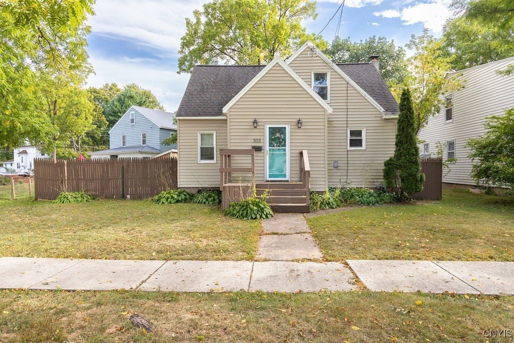 Welcome to this charming Cape Cod-style home located in the heart of the Village of Liverpool, just a short stroll from local restaurants, cafes, and the scenic Onondaga Lake Parkway. This delightful property features a new boiler, low-maintenance vinyl siding and newer vinyl windows that add to its curb appeal and energy efficiency. Step inside through a spacious mudroom that provides a warm welcome and practical entryway. The main level offers a cozy layout with some beautiful hardwood floors and a first-floor bedroom, ideal for guests or single-level living. Upstairs, you'll find two additional bedrooms. The living space extends outdoors with French doors that open to a generous concrete patio, perfect for relaxing or entertaining. The fully fenced yard offers privacy and includes a handy storage shed for your outdoor needs. Downstairs, the partially finished basement adds approximately 300 square feet of additional living space, including a half bathroom with plumbing already roughed in for a future shower—offering great potential for a second full bath. This home is a rare find in a sought-after location, combining village living with comfort and functionality. Don’t miss the opportunity to make it yours!
