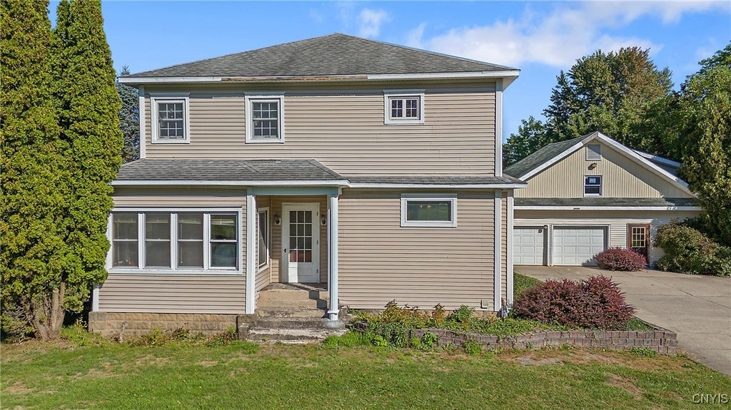 STURDY, STRONG AND LOVED THIS SPACIOUS COLONIAL SITS ON ALMOST AN ACRE AND OFFERS ALL THE SPACE ANYONE WOULD EVER NEED AND STILL HOLDS SOME CHARM AND CHARACTER OF DAYS GONE BY.....UPDATES HAVE BEEN ADDED OVER THE YEARS. BEAUTIFUL HARDWOODS THROUGHOUT MOST OF THE HOME*SPACIOUS LIVINGROOM WITH FIREPLACE*FRENCH DOORS FROM THE LRM LEAD TO THE SUNROOM*FORMAL DININGROOM*DEN W/BRICK WALL FRPLC WITH ACCESS TO THE PRIVATE DECK*KITCHEN OFFERS GREAT STORAGE + ALL APPLIANCES & A PANTRY*1ST FLOOR BEDROOM WAS CONVERTED TO A LAUNDRY (WASHER/DRYER STAY)***EXQUISITE OAK STAIR CASE TAKES YOU TO THE SECOND FLOOR WHERE YOU WILL FIND 4 GOOD SIZE BEDROOMS PLUS AN OFFICE AND A SPACIOUS SPA BATH COMPLETE WITH A JETTED TUB, RECESSED LIGHTING, BIG VANITY AND TILE FLOORING**HARDWOODS AND OAK TRIM SHOWCASE THESE ROOMS*EFFICIENT IN FLOOR HOT WATER MULTI ZONE HEATING THROUGHOUT THE HOME. MANY WINDOWS HAVE BEEN REPLACED.....ABUNDANT GARAGE SPACE....3 BAYS PLUS A WORKSHOP**ADDIIONAL STORAGE AND A 2ND FLOOR LOFT AREA THAT HAS SO MANY USES THINK "STUDIO", GARAGE IS PLUMBED FOR A BATH ALSO. THERE IS A 200 AMP UNDERGROUND ELECTRIC SERVICE THAT SERVICES THE HOME AND GARAGES....THERE IS ALSO A SPRINKLER SYSTEM ON PART OF THE LAWN AND IS TURNED OFF BUT HAS NOT BEEN USED IN A FEW YEARS. GATHER YOUR DECORATING IDEAS AND LET THE FUN BEGIN IN MAKING THIS GEM YOUR NEW HOME! GREAT COUNTRY LOCATION YET CLOSE TO AUBURN AND 35 MINUTES TO SYRACUSE. THIS HOME IS IN GOOD CONDITION HOWEVER BEING SOLD IN AS CONDITION......